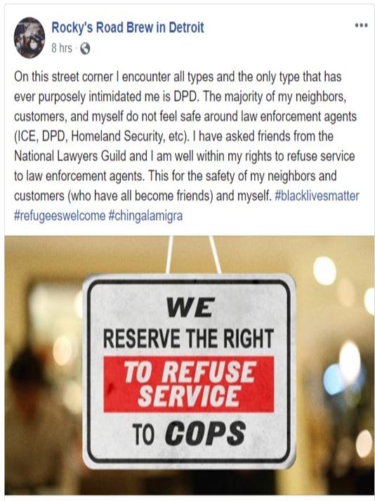 “The majority of my neighbors, customers, and myself do not feel safe around law enforcement agents (ICE, DPD, Homeland Security, etc),” the post said. “I have asked friends from the National Lawyers Guild and I am well within my rights to refuse service to law enforcement agents.