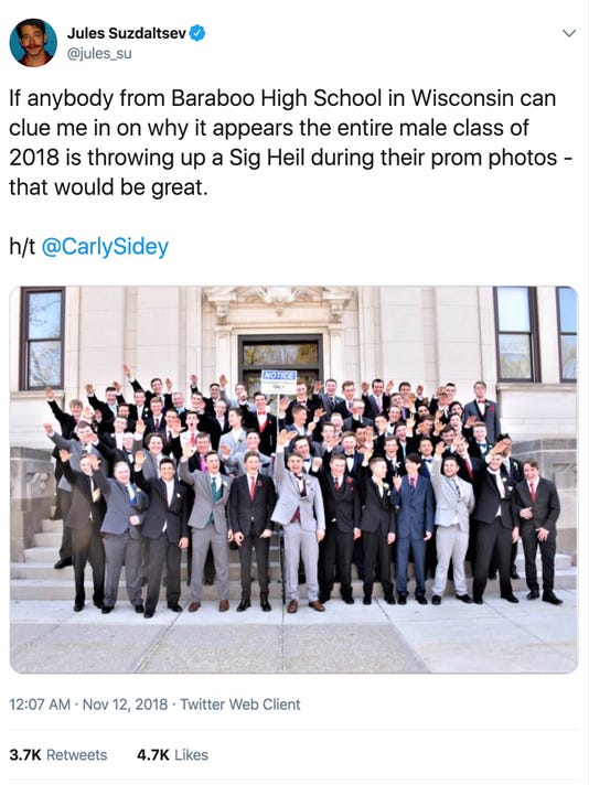 Students who appeared in a photograph that showed several high school boys giving what appears to be a Nazi salute are protected by free-speech rights and are unlikely to face discipline, Baraboo School District officials said.