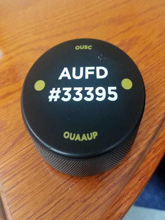 The pucks are imprinted with a number that people can enter on the university’s website to donate money toward the new locks.