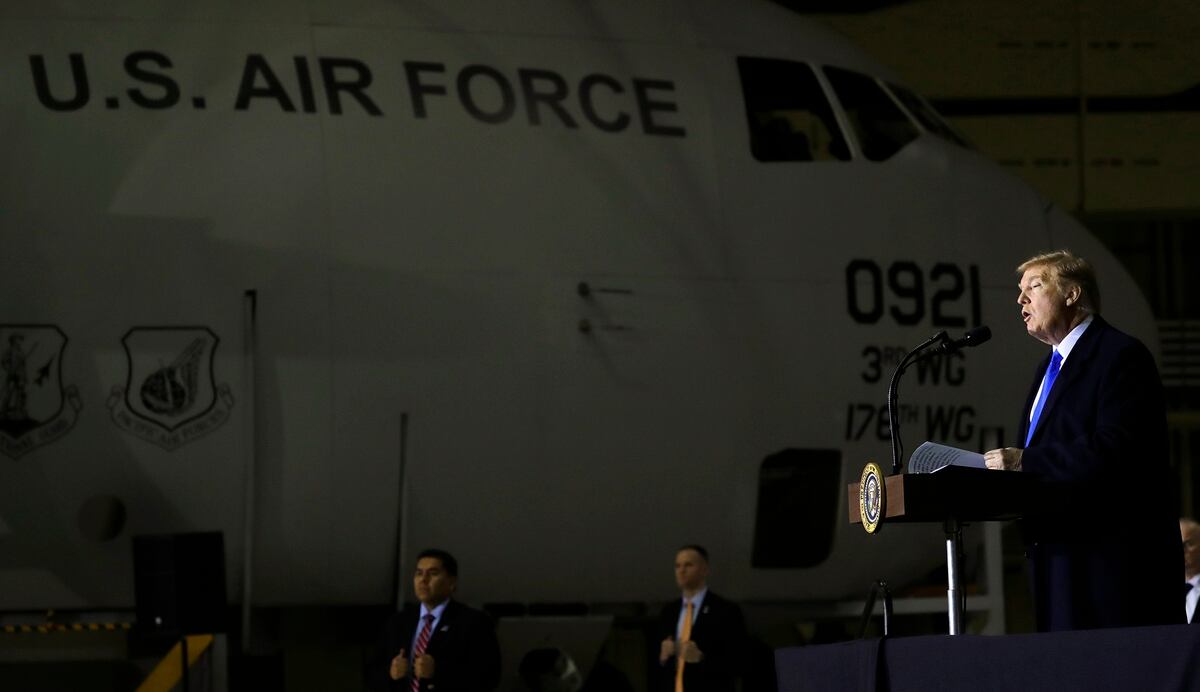 Standing in front of an F-22 Raptor fighter jet at an Anchorage base, Trump thanked all those serving in the military in Alaska, “our country’s last frontier as America’s first line of defense.”